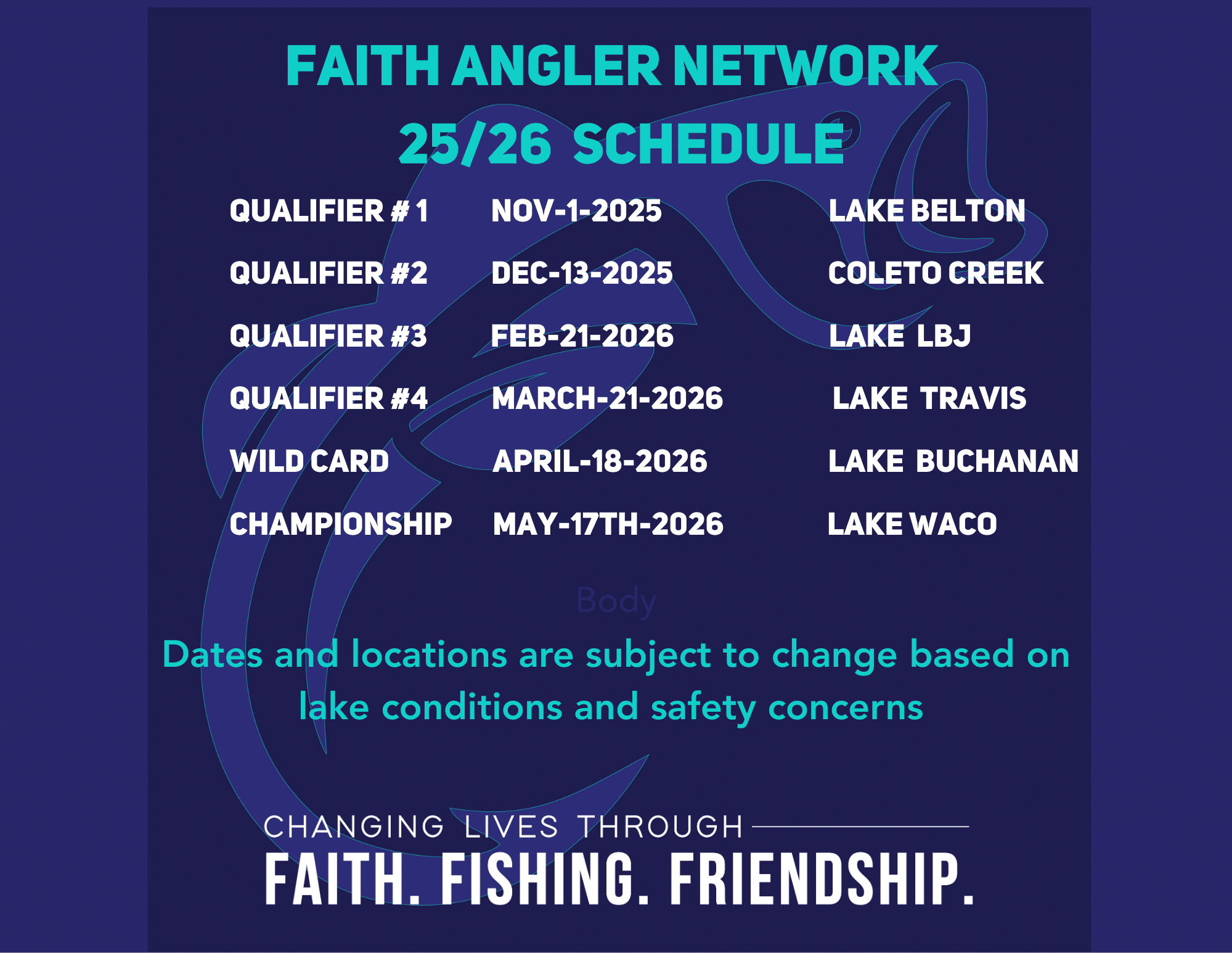 Tournaments Registration Available Here: https://faithanglernetwork.profishingtournaments.com/ NEW Tournament Registration Process for Team Leader (Click Here)